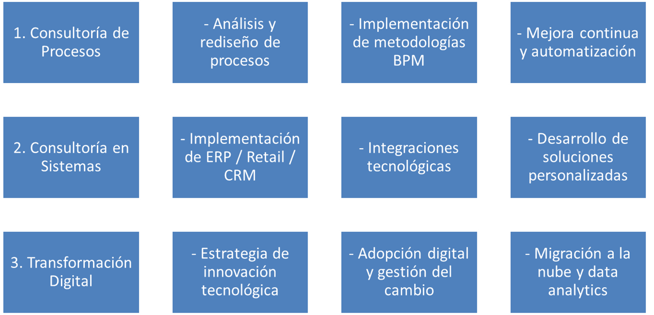 Somos una firma especializada en optimización de procesos empresariales e implementación de soluciones tecnológicas que impulsan la eficiencia y la innovación.